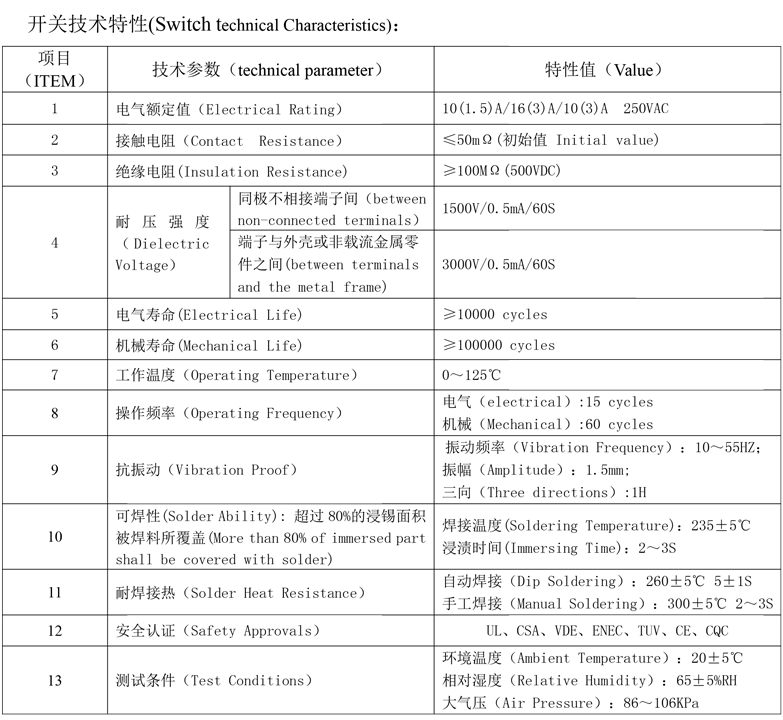 | 1 | इलेक्ट्रिकल रेटिंग | 10(1.5)A/16(3)A/10(3)A 250VAC | |