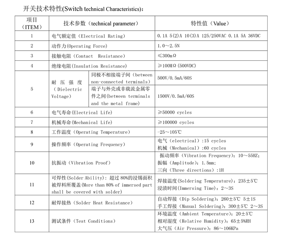 | 2 | ऑपरेटिंग फोर्स | 1.0~2.5N | |