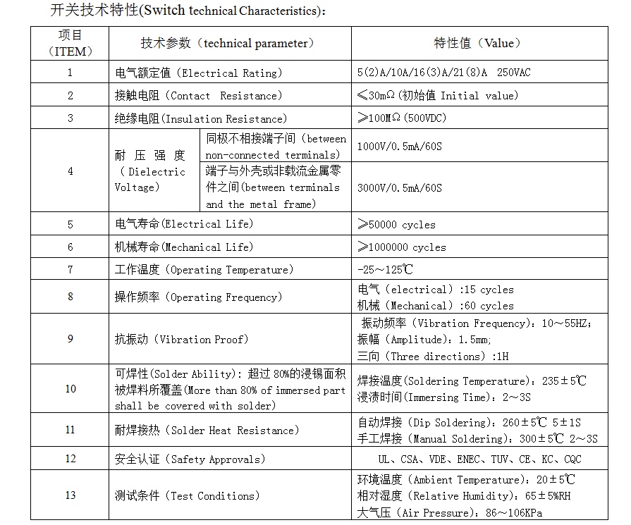 मायक्रो स्विच पॅरामीटर (स्पेसिफिकेशन)