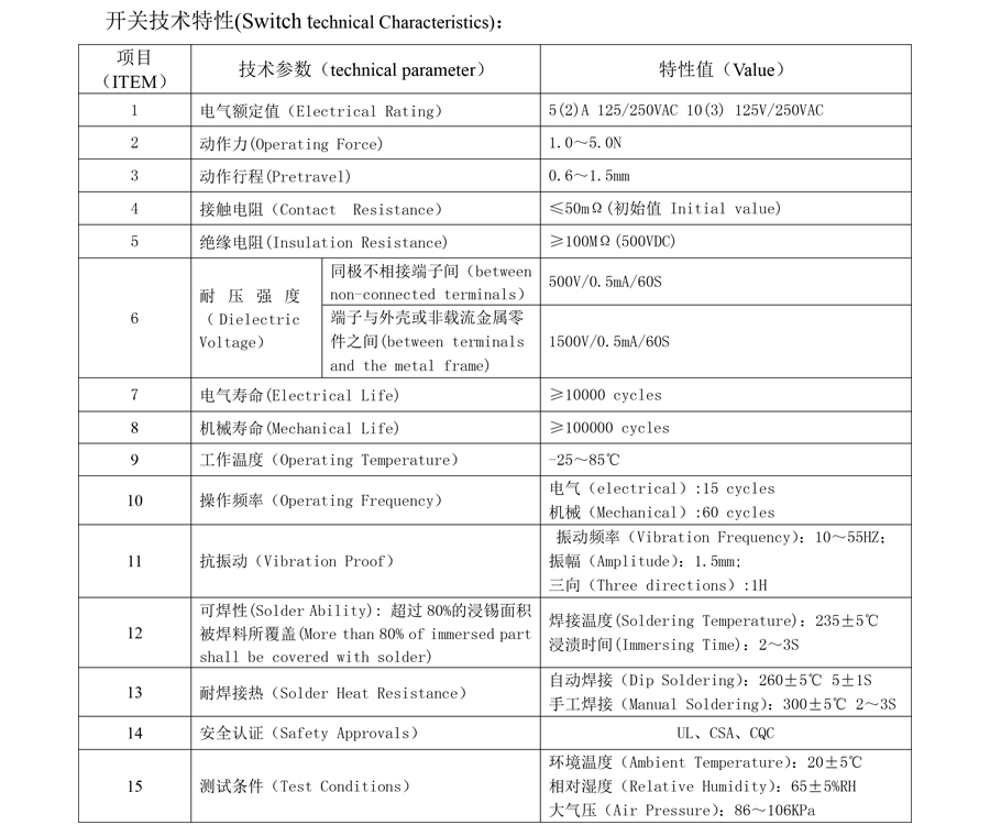 मायक्रो स्विच पॅरामीटर (स्पेसिफिकेशन)