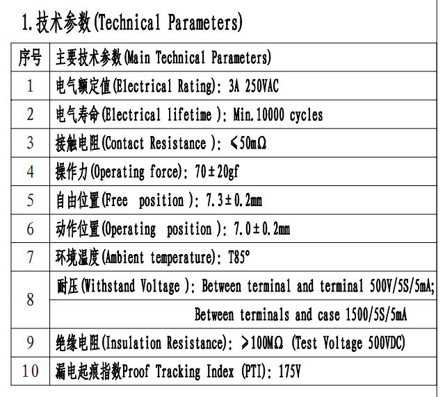 मायक्रो स्विच पॅरामीटर (स्पेसिफिकेशन)